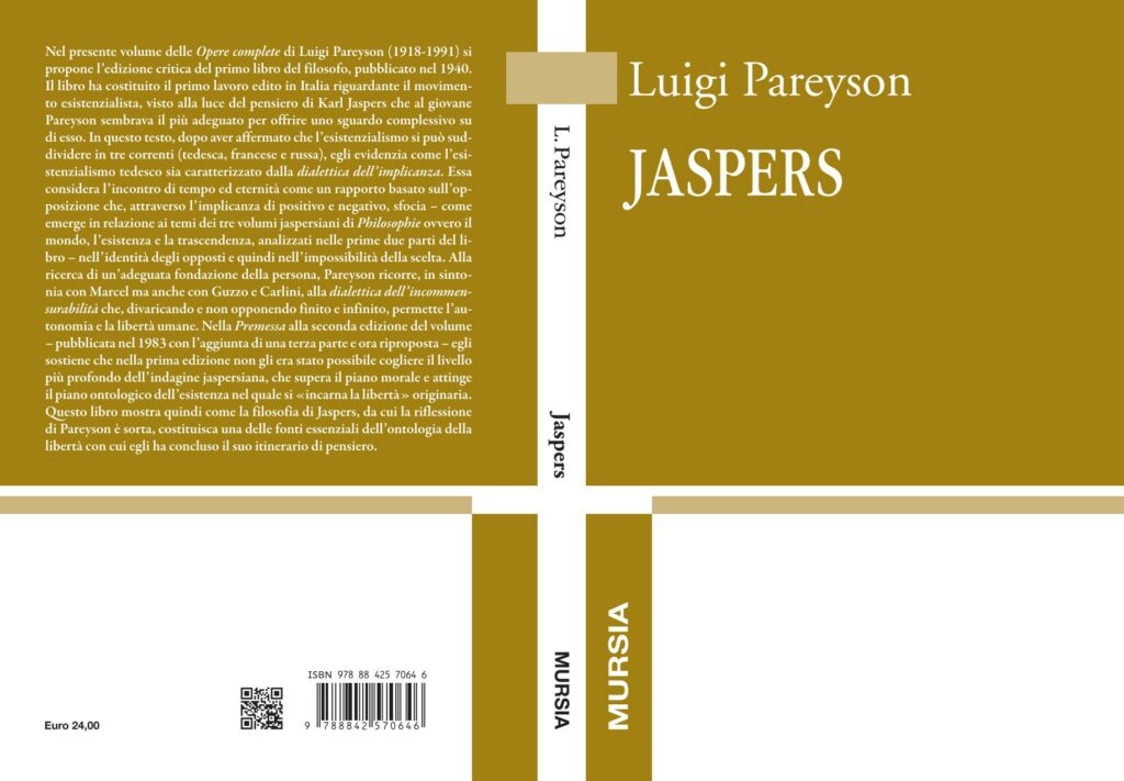 Nel presente volume delle Opere complete di Luigi Pareyson (1918-1991) si propone l’edizione critica del primo libro del filosofo, pubblicato nel 1940. Il libro ha costituito il primo lavoro edito in Italia riguardante il movimento esistenzialista, visto alla luce del pensiero di Karl Jaspers che al giovane Pareyson sembrava il più adeguato per offrire uno sguardo complessivo su di esso. In questo testo, dopo aver affermato che l’esistenzialismo si può suddividere in tre correnti (tedesca, francese e russa), egli evidenzia come l’esistenzialismo tedesco sia caratterizzato dalla dialettica dell’implicanza. Essa considera l’incontro di tempo ed eternità come un rapporto basato sull’opposizione che, attraverso l’implicanza di positivo e negativo, sfocia – come emerge in relazione ai temi dei tre volumi jaspersiani di Philosophie ovvero il mondo, l’esistenza e la trascendenza, analizzati nelle prime due parti del libro – nell’identità degli opposti e quindi nell’impossibilità della scelta. Alla ricerca di un’adeguata fondazione della persona, Pareyson ricorre, in sintonia con Marcel ma anche con Guzzo e Carlini, alla dialettica dell’incommensurabilità che, divaricando e non opponendo finito e infinito, permette l’autonomia e la libertà umane. Nella Premessa alla seconda edizione del volume – pubblicata nel 1983 con l’aggiunta di una terza parte e ora riproposta – egli sostiene che nella prima edizione non gli era stato possibile cogliere il livello più profondo dell’indagine jaspersiana, che supera il piano morale e attinge il piano ontologico dell’esistenza nel quale si «incarna la libertà» originaria. Questo libro mostra quindi come la filosofia di Jaspers, da cui la riflessione di Pareyson è sorta, costituisca una delle fonti essenziali dell’ontologia della libertà con cui egli ha concluso il suo itinerario di pensiero.